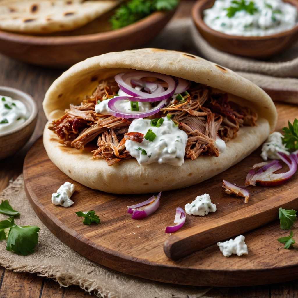 - Anret pitabrød med pulled pork, tzatziki, rødløg og spidskål.